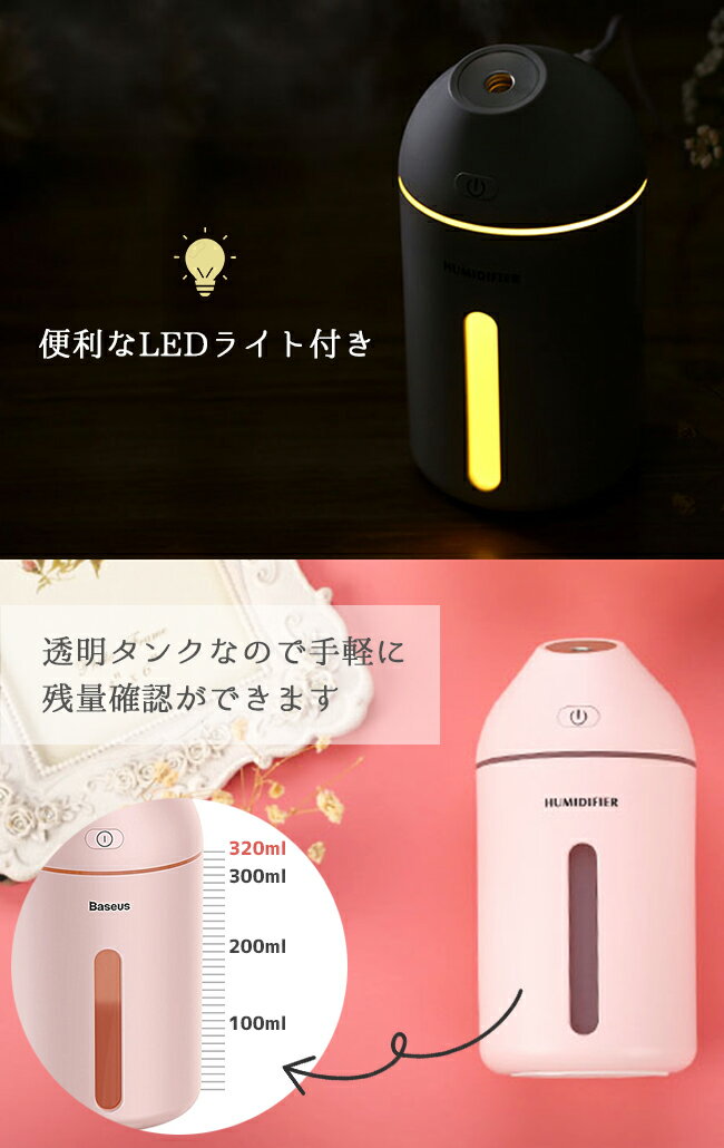 楽天スーパーSALE★加湿器 卓上 USB 超音波式加湿器 320ml 大容量 全2色 オフィス 超音波式 LEDランプ 車載加湿 スキンケア【ネコポス不可】